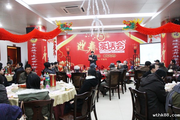 1月10日晚,我校招待餐厅张灯结彩,喜气洋洋,2012年迎新春茶话会在这里举行。校领导袁洪志、吴光林、季翔、任留钦、张登宏、沈士德,全体中层干部,正高职称人员、博士研究生(已获学位的人员),教学名师、省“