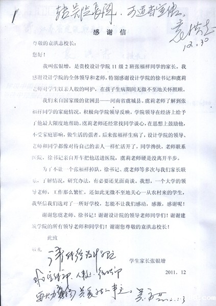 2011年12月30日,党委书记袁洪志收到了建筑设计学院一位学生家长的来信,信中充满了家长对设计学院领导和老师的感激之情。党委书记袁洪志、院长吴光林在信上批示,要求学校有关职能部门要大力宣传关爱学生的优秀事迹,大力弘扬厚生尚能的校训精神。