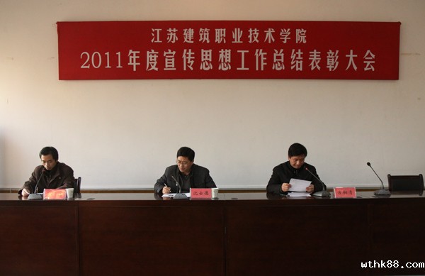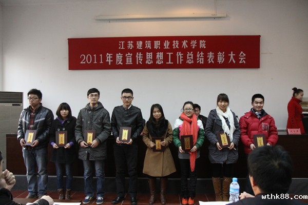 宣传部副部长孙伟作了2011年度宣传思想工作总结报告。宣传部部长方桐清宣读了2011届大学生记者团、广播台、四维网成员聘任文件和2011年度宣传思想工作表彰决定。建管学院党总支、设计学院党总支、装饰学院党总支、教务党总支等4个单位被评为“2011年度宣传思想工作先进集体”,张雪梅等5位教师被评为“优秀特约通讯员”,刘扬等8名学生被评为“优秀学生记者”。沈士德副院长为获奖单位和个人分别颁发了锦旗和证书。