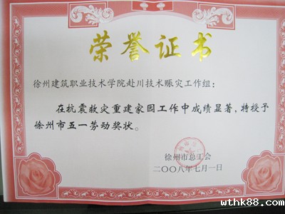 6月30日,在徐州市庆七一暨弘扬抗震救灾精神座谈会上,我院赴川技术赈灾工作组被授予“徐州市五一劳动奖状”。