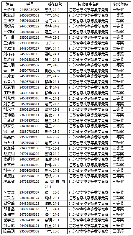 近日,由江苏省高校数学教学研究会组织,江苏第二师范学院承办的2025年“高教社杯”江苏省高校第二十二届高等数学竞赛落下帷幕。我校参赛学生表现优异,共获得江苏省专科组一等奖7项、二等奖18项、三等奖18项,其中3名学生获得“高教社智数奖”。我校在此次竞赛中的获奖等级、获奖比例均在同类院校中名列前茅。