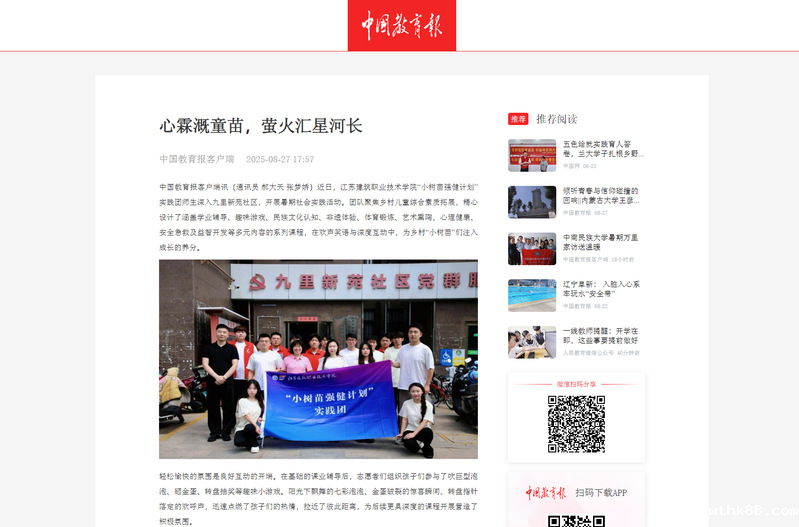 中国教育报客户端讯(通讯员 郝大天 张梦娇)近日,betway客服“小树苗强健计划”实践团师生深入九里新苑社区,开展暑期社会实践活动。团队聚焦乡村儿童综合素质拓展,精心设计了涵盖学业辅导、趣味游戏、民族文化认知、非遗体验、体育锻炼、艺术熏陶、心理健康、安全急救及益智开发等多元内容的系列课程,在欢声笑语与深度互动中,为乡村“小树苗”们注入成长的养分。